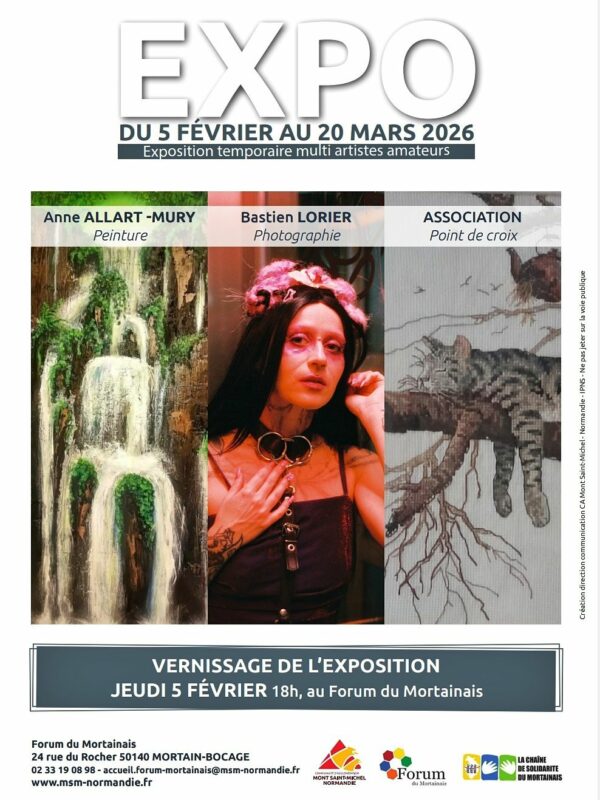Vernissage du jeudi soir 5 février à partir de 18 h au forum du Mortainais au 20 mars 2026.