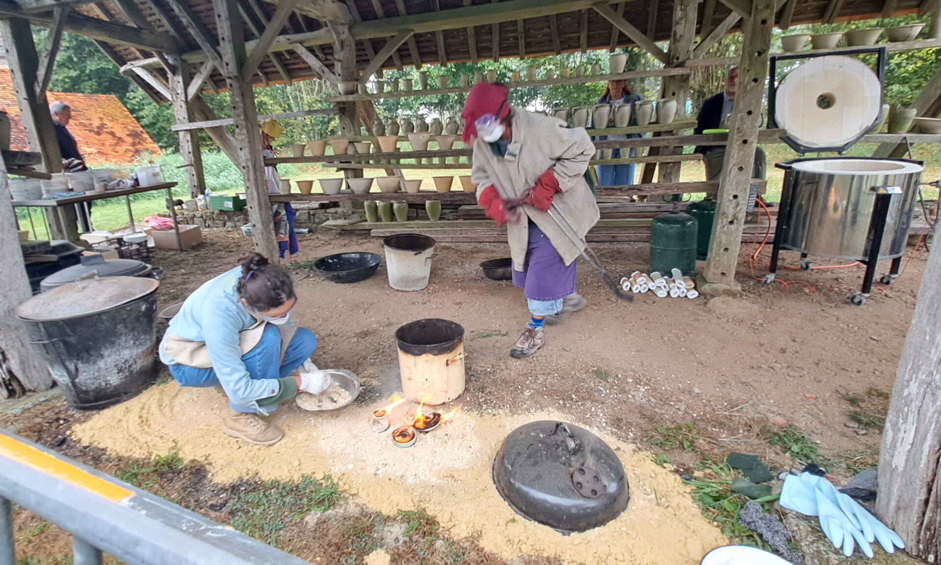 Les médiatrices céramistes ont conduit une cuisson dans le four chainette est monté jusqu’à 1090°C. Défournement prévu dans les jours qui viennent.